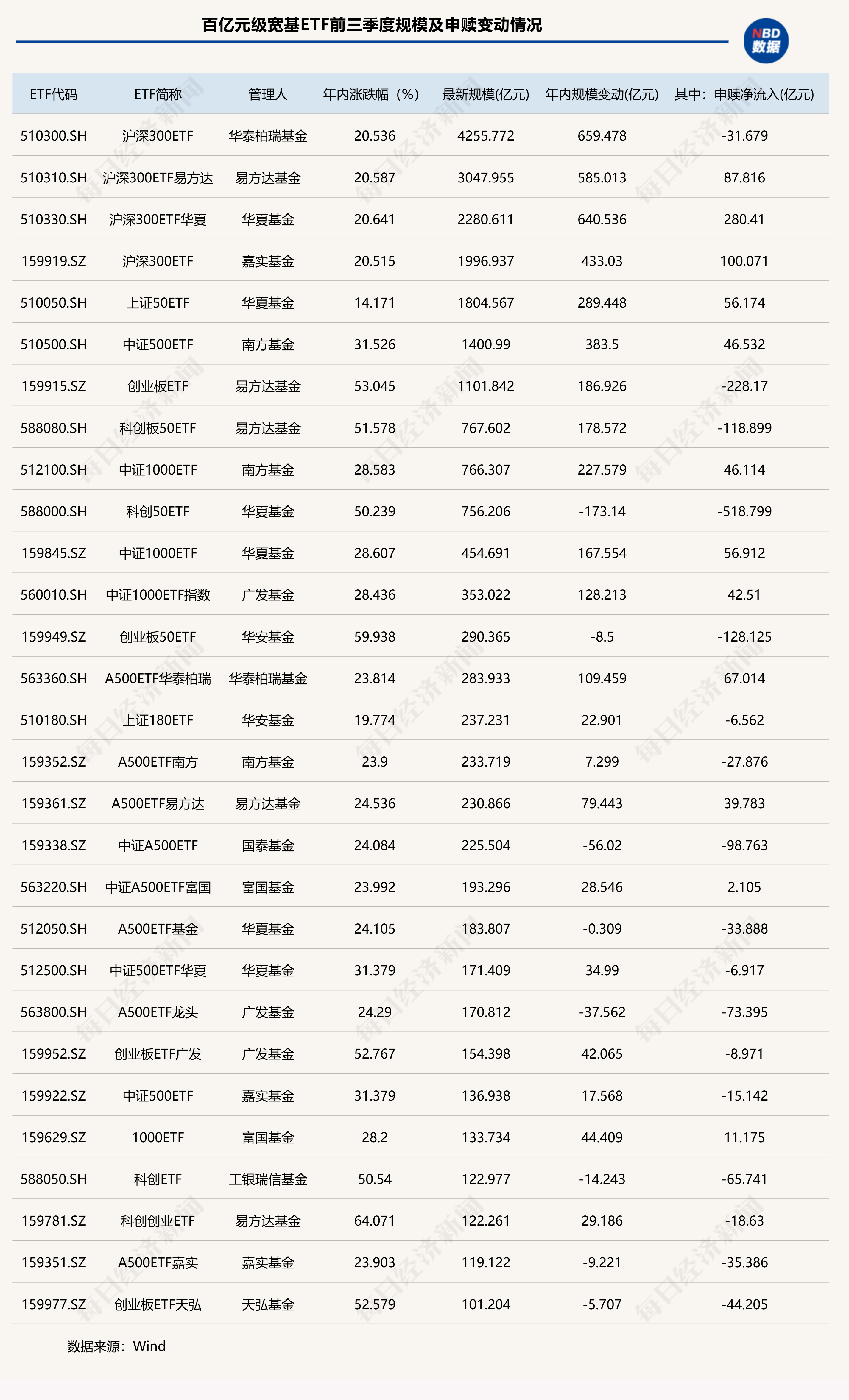 Wind數(shù)據(jù)顯示,截至9月30日,全市場(chǎng)共有29只寬基ETF規(guī)模超過(guò)100億元。其中,華泰柏瑞旗下滬深300ETF規(guī)模達(dá)到4255.77億元穩(wěn)居第一,易方達(dá)、華夏和嘉實(shí)基金旗下滬深300ETF排在第二到第四,規(guī)模分別為3047.96億元、2280.61億元和1996.94億元。業(yè)績(jī)方面,這4只“巨無(wú)霸”ETF前三季度均漲超20%,相對(duì)滬深300指數(shù)有小幅超額,整體表現(xiàn)穩(wěn)健。