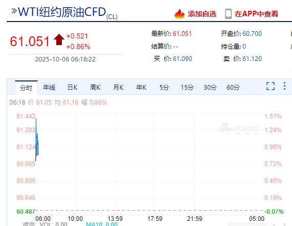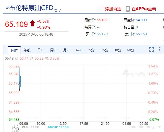 受地緣政治局勢影響,國際原油開盤一度漲超1%,截至發(fā)稿,布倫特原油報65.109美元,漲幅0.90;WTI紐約原油報61.051美元,漲幅0.86%。