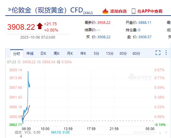 截至發(fā)稿,現(xiàn)貨黃金報(bào)3908.22美元/盎司。