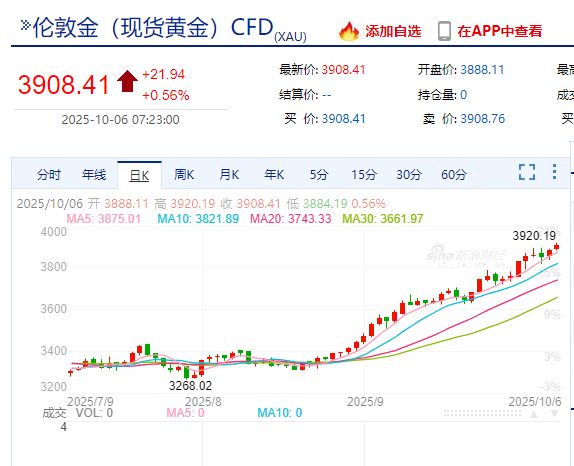 10月6日,現(xiàn)貨黃金本周開局維持強(qiáng)勢(shì),上破3920美元/盎司關(guān)口,再創(chuàng)歷史新高!距離首次突破3800美元關(guān)口僅不到10天。