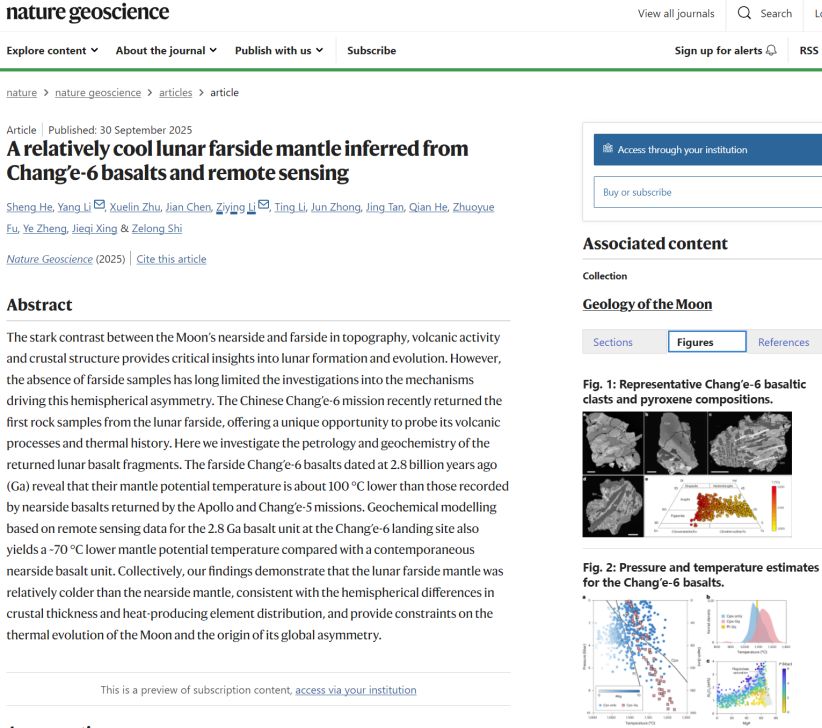 10月6日,國家航天局等聯(lián)合發(fā)布嫦娥六號月球背面樣品研究新成果:中國科學(xué)家首次發(fā)現(xiàn)月球背面月幔比正面更“冷”,深化了對月球“二分性”的認(rèn)識。該研究由中核集團(tuán)等合作完成,已刊發(fā)于國際期刊。另據(jù)10月1日消息,嫦娥六號就位光譜探測取得突破,揭示了月球水分布特征,為月球水的形成機(jī)制與未來利用提供依據(jù)。