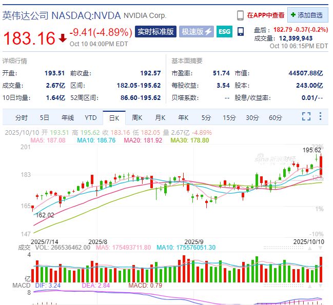 英偉達(dá)報183.16美元,跌4.89%,其市值一夜蒸發(fā)2287億美元(16318億元)。