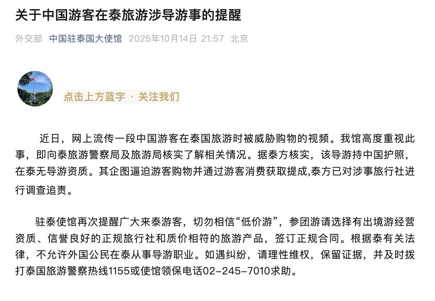 10月14日晚,中國(guó)駐泰國(guó)大使館發(fā)布《關(guān)于中國(guó)游客在泰旅游涉導(dǎo)游事的提醒》: