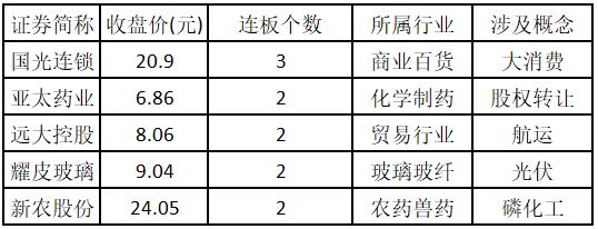 從連板情況來看,今日首板個(gè)股有58只;2連板的個(gè)股有6只;3連板及以上的個(gè)股有1只。今日連板數(shù)排名前5的個(gè)股包括國(guó)光連鎖、亞太藥業(yè)、遠(yuǎn)大控股、耀皮玻璃、新農(nóng)股份,具體如下表所示。