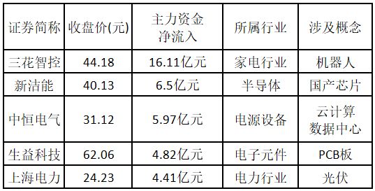 從主力資金來看,今日漲停板個(gè)股中,主力資金凈流入金額排名前5的個(gè)股分別為三花智控、新潔能、中恒電氣、生益科技、上海電力。