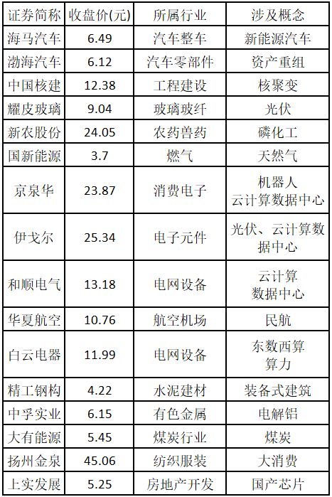 漲停板個(gè)股中,股價(jià)創(chuàng)出近一年新高的個(gè)股有16只(不包括創(chuàng)出歷史新高的個(gè)股),包括海馬汽車、渤海汽車、中國(guó)核建、耀皮玻璃、新農(nóng)股份、國(guó)新能源、京泉華、伊戈?duì)?、和順電氣、華夏航空、白云電器、精工鋼構(gòu)、中孚實(shí)業(yè)、大有能源、揚(yáng)州金泉、上實(shí)發(fā)展,具體如下表所示。