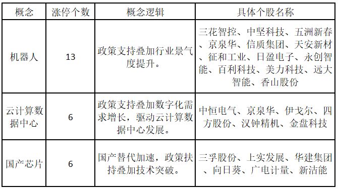 從概念特征來看,今日漲停板個(gè)股中,機(jī)器人、云計(jì)算數(shù)據(jù)中心、國(guó)產(chǎn)芯片概念的個(gè)股最多。