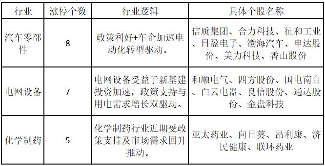 從行業(yè)特征來看,今日漲停板個(gè)股中,汽車零部件、電網(wǎng)設(shè)備、化學(xué)制藥行業(yè)的個(gè)股最多。