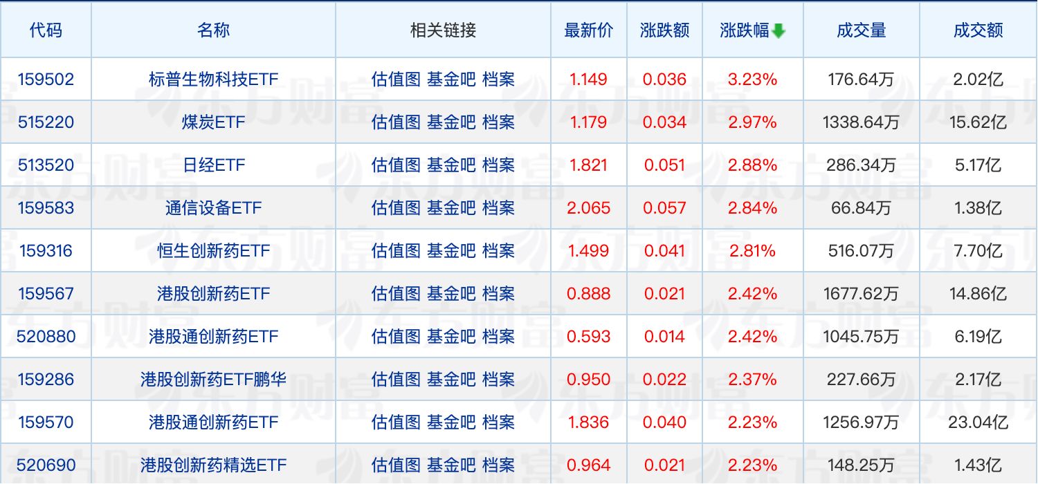具體來看,標普生物科技ETF領(lǐng)漲3.23%,港股創(chuàng)新藥相關(guān)ETF均有所表現(xiàn)。