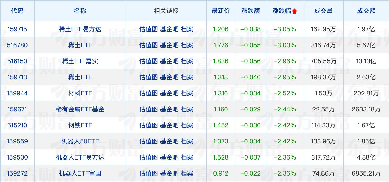 下跌方面,稀土相關(guān)ETF悉數(shù)回調(diào),最高下跌3.05%。