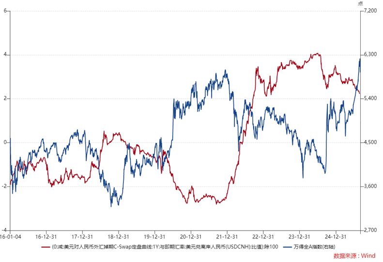 展望后市,A股整體下行空間或較為有限。今年以來,人民幣持續(xù)走強(qiáng),對市場風(fēng)險偏好的提振作用明顯。與前幾年相比,匯率成為影響A股表現(xiàn)的關(guān)鍵外生變量。考慮到匯率本身的絕對值易受外部擾動,跨期可比性較弱,引入外匯掉期與中美匯率比值指標(biāo),更能從相對視角衡量中美貨幣的吸引力變化。從該指標(biāo)走勢來看,今年以來美元相對人民幣的吸引力持續(xù)下降,并在趨勢上確認(rèn)結(jié)束了自2021年9月以來長達(dá)三年的上升周期。